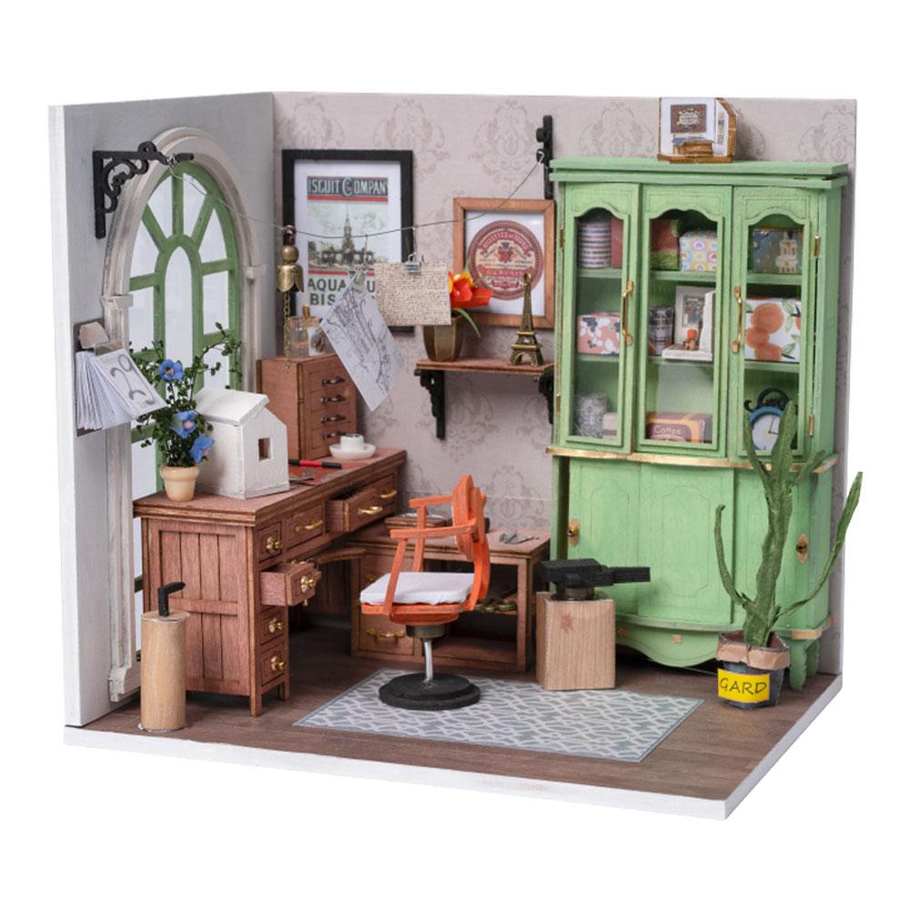 柔らかい緑色の大きな窓枠がアクセントになっています!全体的に落ち着いたカラーリングで構成されているので、エイジング塗装との相性も抜群です◎机や扉付きの飾り棚など存在感のある家具が置かれていて、エイジング加工を施すとノスタルジックな空間が再現できるでしょう。製作時間の目安はおよそ18時間です。